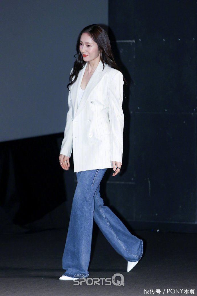 郑秀金下半身搭配了一条蓝色微喇牛仔裤,这种蓝色清新又减龄,和白色竖条纹西装外套搭配起来,让人眼前一亮!脚上搭配一双白色尖头高跟鞋,优雅又有女人味!高腰微喇牛仔裤,搭配白色尖头高跟鞋,走路优雅,自带知性气质!